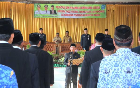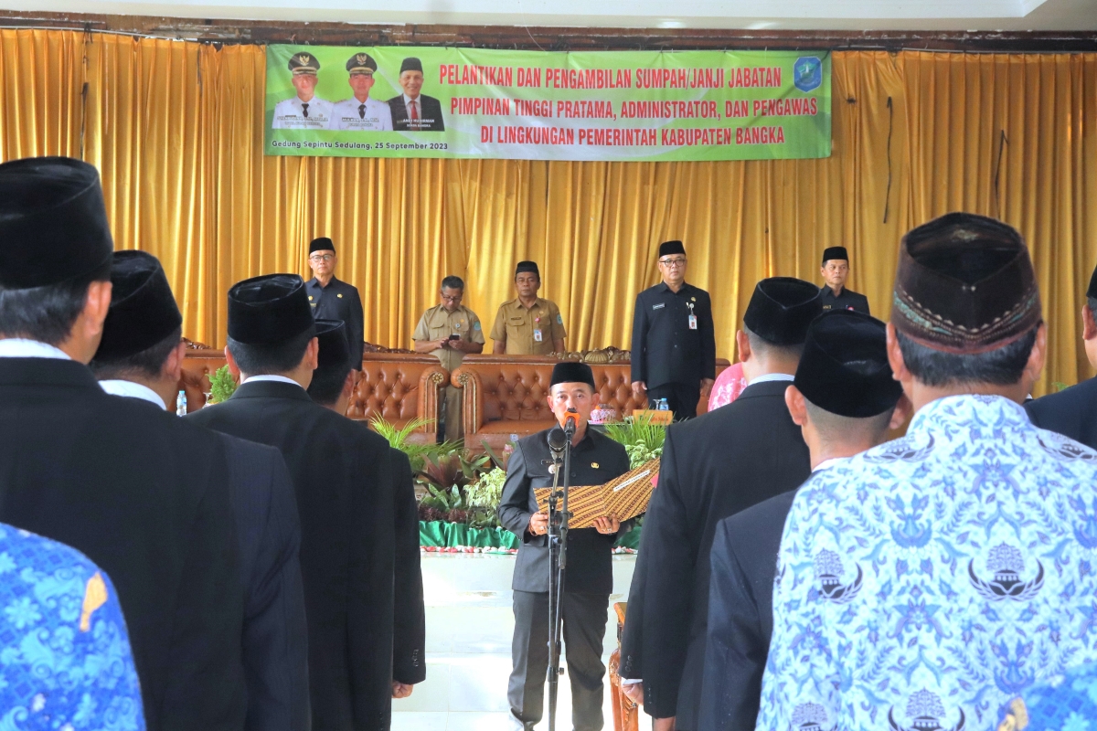 Bupati Bangka H.Mulkan, SH., MH. memimpin acara pelantikan dan pengambilan sumbah jabatan  Pimpinan Tinggi Pratama, Pejabat Administrator dan Pengawas serta 103 Jabatan Fungsional Teknis (JFT). Pelantikan dan pengambilan sumpah jabatan dilakukan hari ini senin (25/9/2023) di Gedung Sepintu Sedulang Sungailiat.
